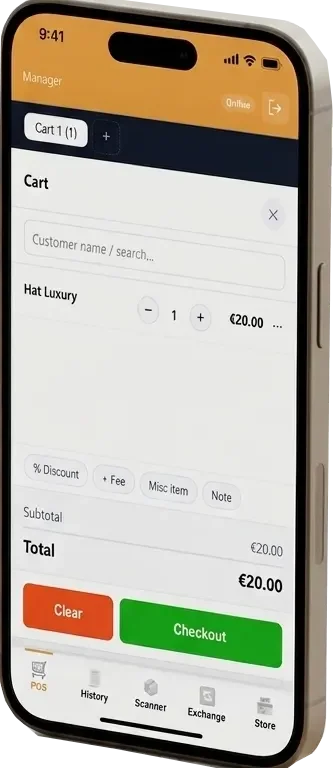 | Mobile POS | Multi-cart support (up to 10), Haptic feedback on scan, Category filter chips, Floating Action Button (FAB) with live item count, and cart-preview "pills." |